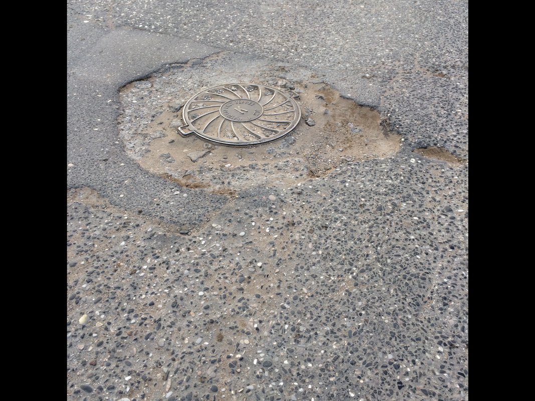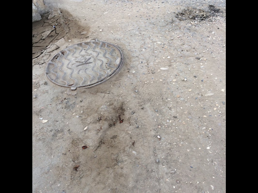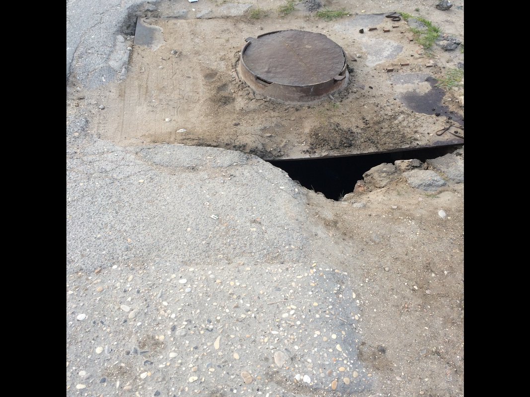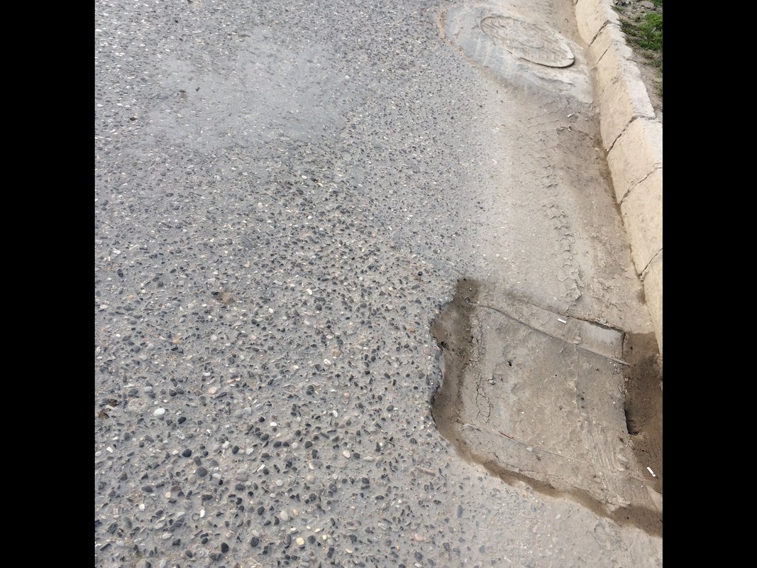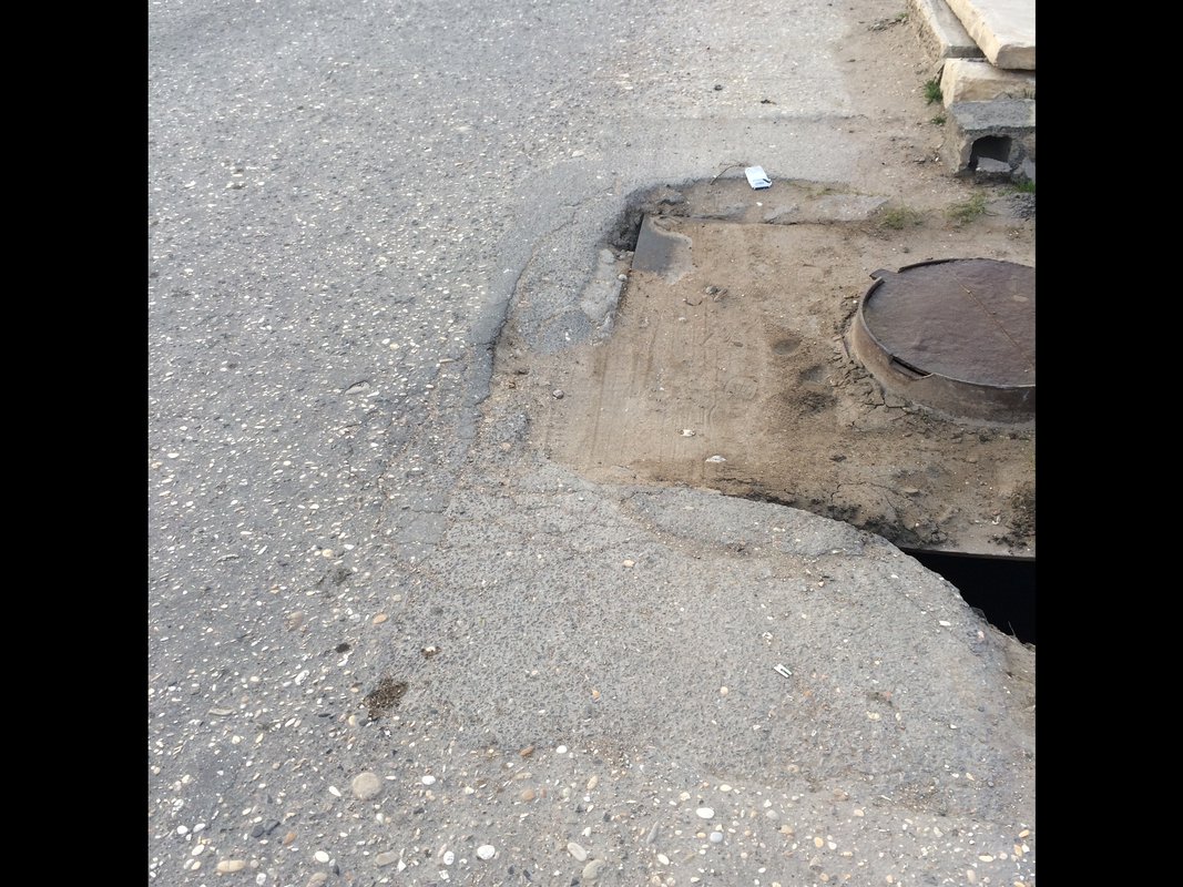 Неровная дорога с ямами и латками, если обратить внимание на люк сразу бросается в глаза, что люки это конек дорожников города Каспийска , а в данном случае они превзошли сами себя