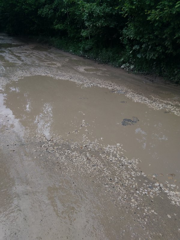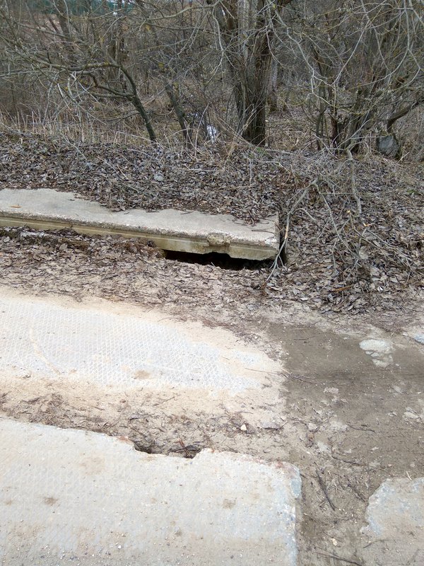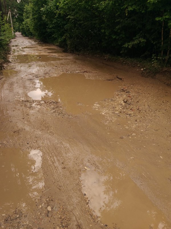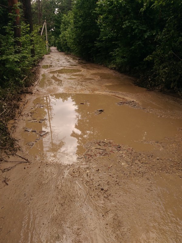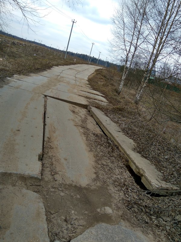 Покрытие дорожными плитами. Часть плит подмыло ручьем и одна плита сильно просела. По этой дороге люди возят детей в школу и дет.сад, ездят на работу, т.к. автобусного сообщения...