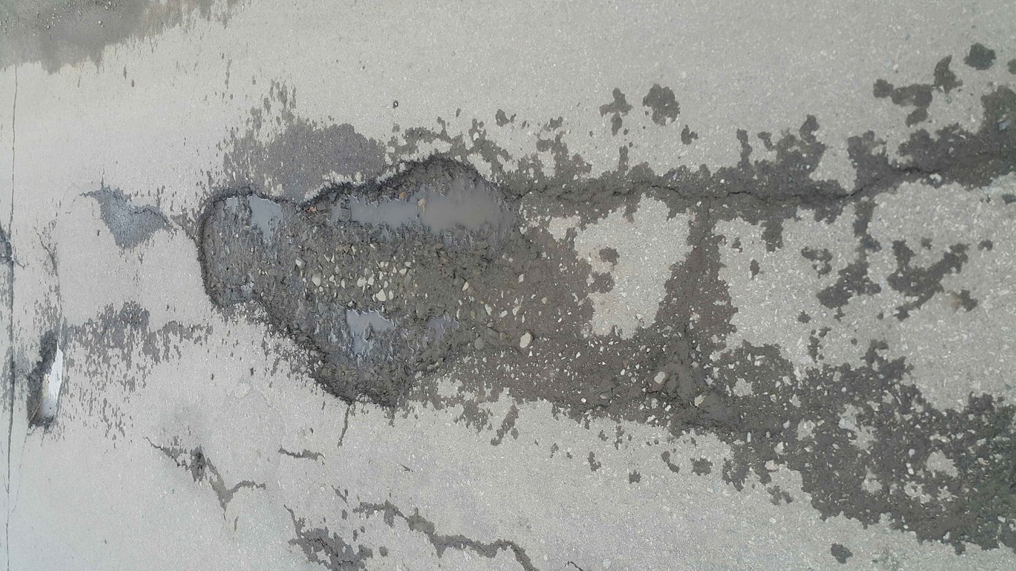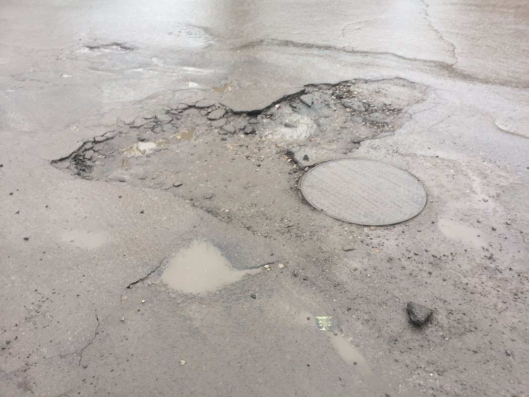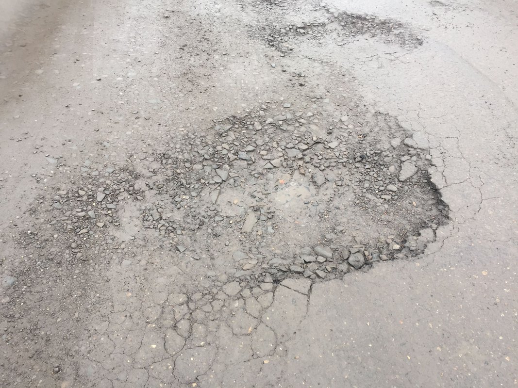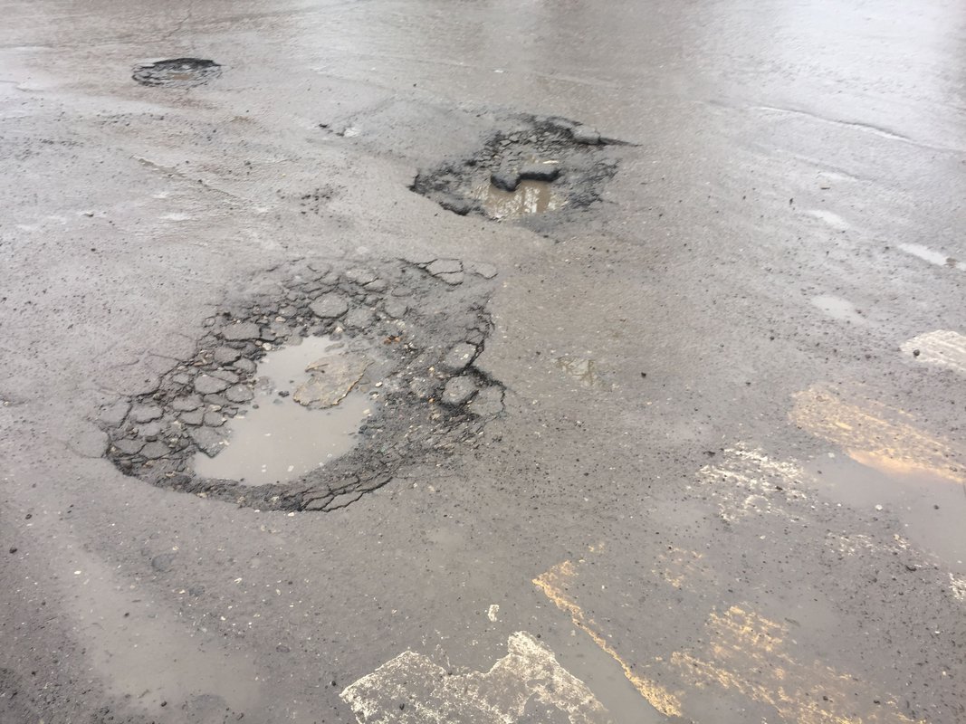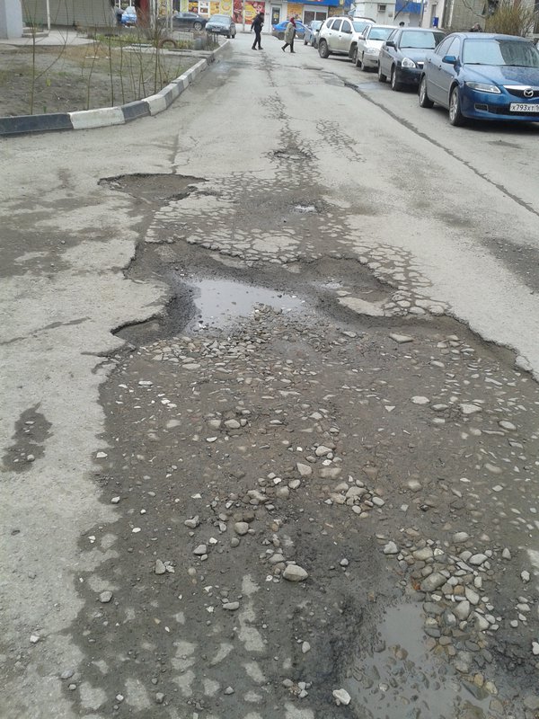 Огромные ямы поперёк всей ширины проезжей части. Между платной парковкой и домом Авиагородок 18.