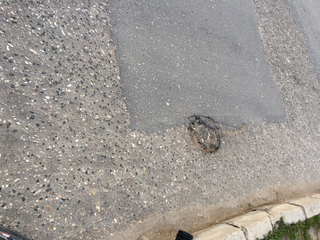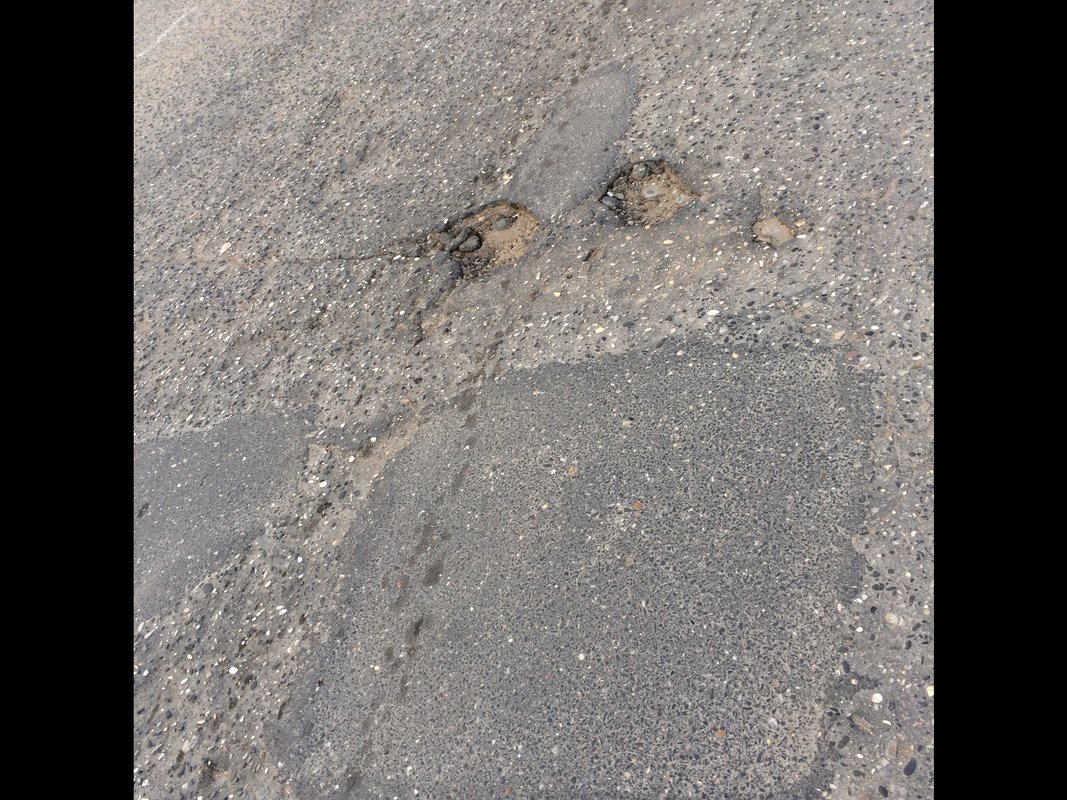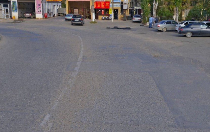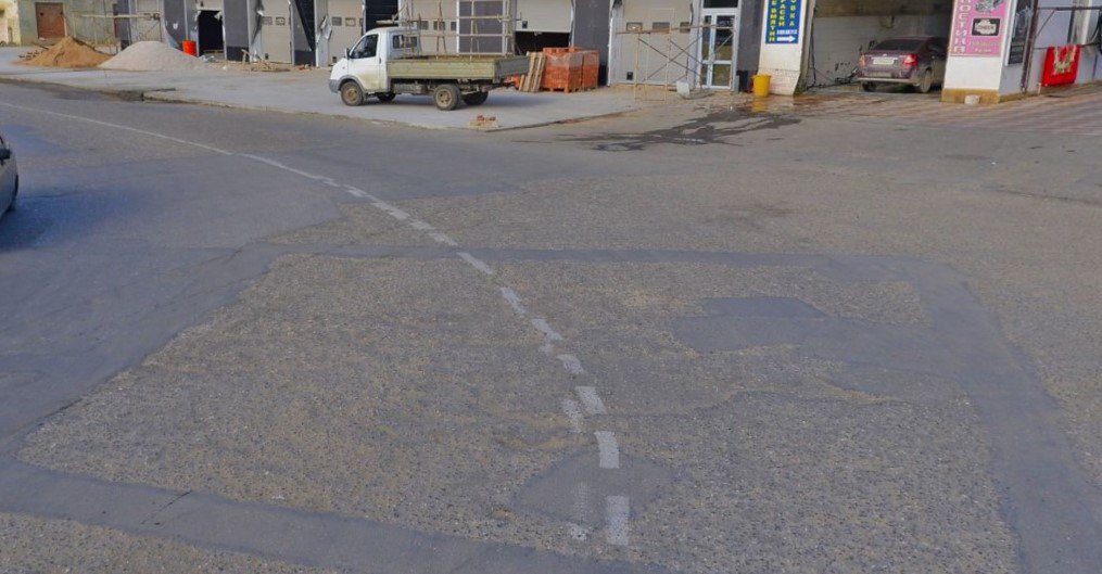 Неровная дорога с ямами и латками, если обратить внимание на люк сразу бросается в глаза, что люки это конек дорожников города Каспийска , а в данном случае они превзошли сами себя
