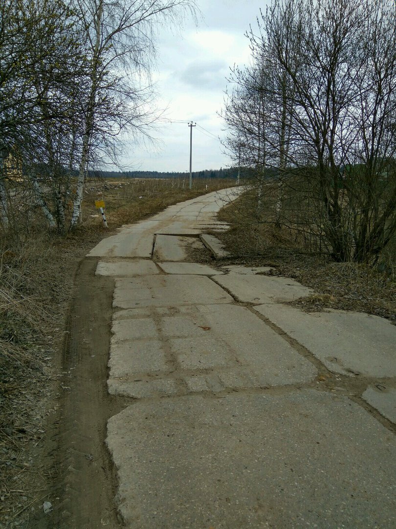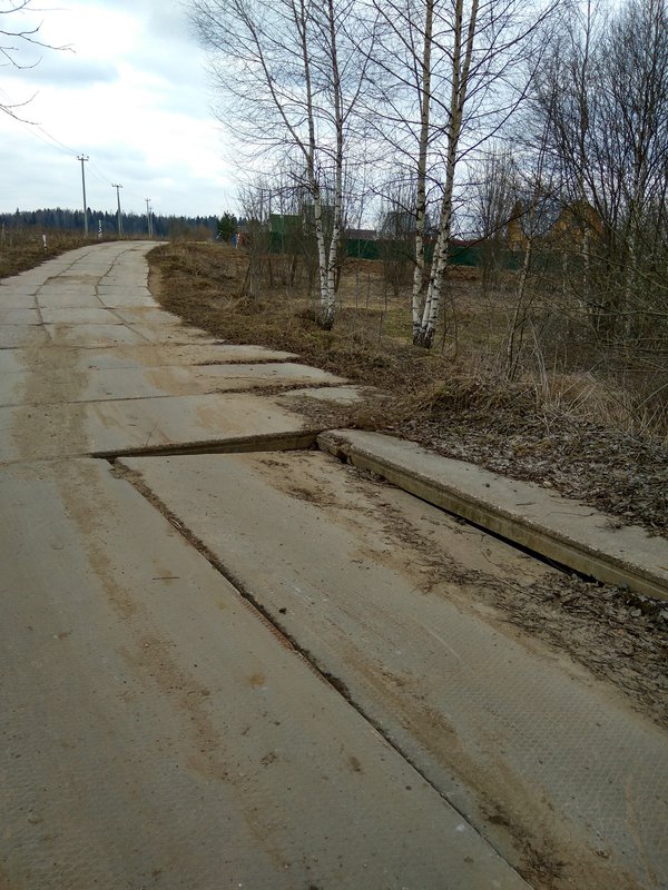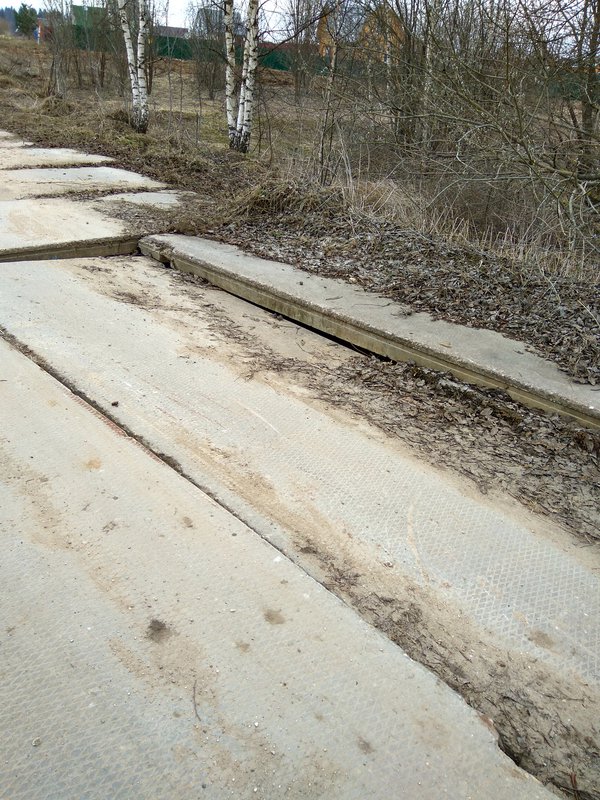 Покрытие дорожными плитами. Часть плит подмыло ручьем и одна плита сильно просела. По этой дороге люди возят детей в школу и дет.сад, ездят на работу, т.к. автобусного сообщения нет. Если так и оставить, плита под чьим нибудь автомобилем провалится совсем. Аварийно опасный участок.