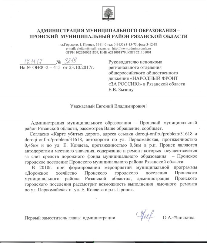 16.11.2017 администрация Пронского района сообщила, что указанный участок относится к автодорогам местного значения. При формировании профильной муниципальной программы на 2018 год администрация рассмотрит возможность выделения средств на ямочный ремонт.