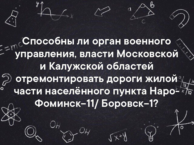 Орган военного управления (#ШойгуСК), власти Московской (#ВоробьёвАЮ), Калужской (#АртамоновАД) областей, контролирующие и надзорные органы не в состоянии с 2013г. организовать совместную работу по разрешению "дорожного вопроса" на территории жилой части населённого пункта Наро-Фоминск-11/ Нара-11/ Боровск-1/ военный городок № 2538Д/ военный городок № 14 (Митяево) для улучшения качества жизни жителей Московской и Калужской областей!!! http://dorogi-onf.ru/problem/466/ http://dorogi-onf.ru/problem/34970/ http://dorogi-onf.ru/problem/35682/ https://dorogi-onf.ru/problem/47493/ Наро-Фоминск-11/ Нара-11/ Боровск-1/ военный городок № 2538Д/ военный городок № 14 (Митяево) - дорожное покрытие жилой части городка полностью не соответствует дорожным ГОСТам, вступившим в силу 1 сентября 2018г. и СНиП!!!, https://vk.com/album-92690509_225030735 Жители домов с № 1 по № 12 г.Наро-Фоминск-11 платят транспортный налог в бюджет Московской области!!!, https://youtu.be/7iFrEIm9ULc Жители дома № 13 г.Боровск-1 транспортный налог уплачивают в бюджет Калужской области!!! Просим организовать комплекс мер Государственного реагирования направленных побудить собственника дорог жилой части населенного пункта Наро-Фоминск-11/ Нара-11/ Боровск-1/ военный городок № 2538Д/ военный городок № 14 (Митяево) привести их в полное соответствие ГОСТ и СНиП!!!, http://adm-sov.ru/message/index{page-2}.html #shoygupozor, #военныегородкиподмосковья, #военныегородки, #нарофоминск11, #нара11, #боровск1, #митяево, #микрорайонмитяево, #военныйгородок2538Д, #военныйгородок14, #вч02014, #вч75555, #онф, #онфмо, #оаославянка, #ооогужф, #фгбуцжку, #фгбуцжкуповксморф, #морф, #вооружённыесилы, #шойгу, #шойгуск, #московскаяобласть, #подмосковье, #андрейворобьёв, #воробьёваю, #калужскаяобласть, #артамоновад, #федеральнаяпроблема, #губернатормо, #стратегиягубернатора, #армия2019, #городскаясреда, #задорогибезям, #убитыедороги, #экоонф, #ecoonf, #баранован, #депутатбаранов