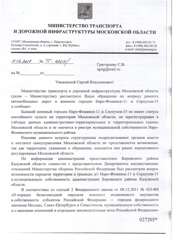 Наро-Фоминск-11/ Боровск-1 (Митяево) - территория убитых дорог не соответствующих ГОСТ Р 50597-93, ГОСТ 10807-78, ГОСТ 13508-74, ГОСТ 23457-86 и СНиП 2.05.02-85!!!, http://dorogi-onf.ru/problem/466/ http://dorogi-onf.ru/problem/34970/ Жители г.Наро-Фоминск-11 платят транспортный налог в бюджет Московской области!!! Жители дома № 13 г.Боровск-1 транспортный налог уплачивают в бюджет Калужской области!!! Фотографии состояния дорожного покрытия в бывшем военном городке Наро-Фоминск-11/ Боровск-1 (Митяево), https://vk.com/album-92690509_225030735 О защите прав и законных интересов жителей г.Наро-Фоминск-11/ г.Боровск-1 и г.Серпухов-15 Московской области!!!, https://democrator.ru/petition/o-zashhite-prav-i-zakonnyh-interesov-zhitelej-gnar/?share_mark=0b9dda30636d4d5e2ddbc1c4b55fabf7 Проблема зарегистрирована на портале "Добродел" от 6 января 2018г. № 1230948, https://dobrodel.mosreg.ru/claims/1230948 #наро_фоминск_11, #нарофоминск11, #нара_11, #нара11, #боровск_1, #боровск1, #митяево, #микрорайон_митяево, #микрорайонмитяево, #военный_городок_14, #военныйгородок14, #вч02014, #вч75555, #курилово, #серпухов_15, #серпухов15, #онф, #онф_мо, #онфмо, #оаославянка, #ооогужф, #фгбу_цжку_по_вкс_мо_рф, #фгбу_цжку, #фгбуцжку, #фгбуцжкуповксморф, #мо_рф, #морф, #вооружённые_силы, #вооружённыесилы, #шойгу, #шойгуск, #московская_область, #московскаяобласть, #подмосковье, #андрейворобьёв, #воробьёваю, #калужская_область, #калужскаяобласть, #артамоновад, #федеральная_проблема, #губернатормо, #стратегиягубернатора, #армия2017, #городскаясреда, #задорогибезям, #убитыедороги, #экоонф, #ecoonf