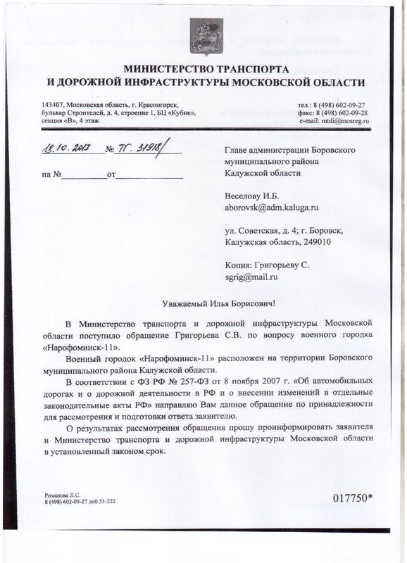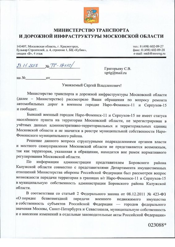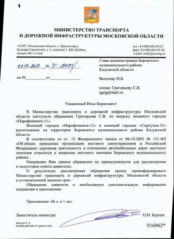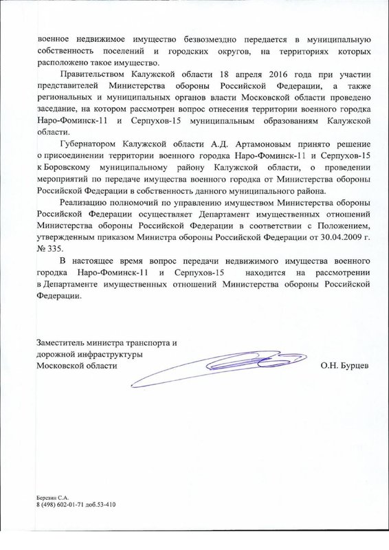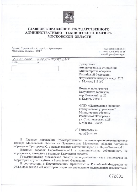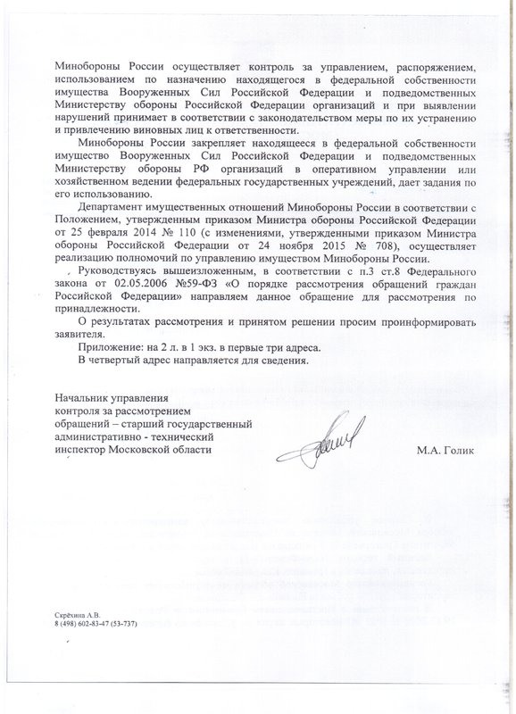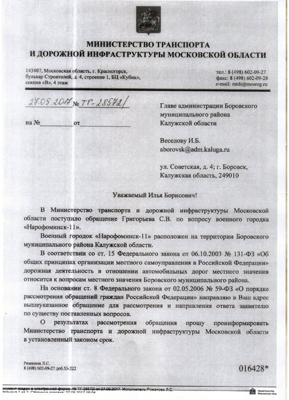 С 2013г. жители нашего городка неоднократно обращались в подразделения УГИБДД УМВД России по Калужской и Московской областей, Администрации Боровского и Наро-Фоминского районов, органы военной прокуратуры о неудовлетворительном состоянии улично-дорожной сети населённого пункта Наро-Фоминск-11 Московской области (г.Боровск-1 Калужской области), которая с 2009г. не учтена установленным порядком как имущество ФГКУ «Центральное территориальное управление имущественных отношений» Министерства обороны Российской Федерации и Государственное имущество, так как сведения о нём отсутствуют в Федеральном агентстве по управлению государственным имуществом, о чём свидетельствуют неоднократные ответы из данного ведомства. Вот уже 3 года, безрезультатные проводимые проверки, как специалистами прокуратур Западного военного округа, Калужского гарнизона, в/ч 30642, прокуратур Московской и Калужской областей, Боровского и Наро-Фоминского районов, органов безопасности дорожного движения Калужской и Московской областей, не приводят к ожидаемым результатам – постановке дорог на баланс и проведению ремонта, в соответствии с предъявляемыми требованиями ГОСТ и СНиП: https://vk.com/public92690509?z=album-92690509_225030735. По всей видимости, Ваши подчинённые прокуроры и иные государственные структуры, с 2009г. не в состоянии провести полную и всестороннюю проверку, в ходе которой установить конкретных виновных лиц от действия и бездействия которых инфраструктура городка пришла в упадок и не принимается на баланс военного ведомства, привлечь их к ответственности, а также принудить к исполнению своих непосредственных должностных обязанностей и наконец-то разрешить дорожный вопрос в нашем населённом пункте!!! Так, как ФГУП «ЦТУИО» МО РФ уже, как минимум 2 года обещает органам прокуратуры и жителям принять меры по организации приёма улично-дорожной сети городка на балансовый учёт, а также меры по включению объектов недвижимости в техническое задание к соответствующему государственному контракту с ФГУП «Ростехинвентаризация – Федеральное БТИ». Но ничего не меняется. Поговариваю, что государственный контракт, на который все ссылаются в своих ответах-отписках, уже давно не действует!?! Сколько это безобразие будет продолжаться!?! В настоящее время состояние дорог всей жилой части городка и придворовых территорий не изменилось, требуют проведения капитального ремонта!!! Выделить денежные средства, на который целевым назначением не представляется возможным по известной Вам причине - отсутствия собственника - балансодержателя (обслуживающей организации) у наших дорог. Привлекать внебюджетное финансирование, в нашей ситуации, чиновники не спешат. Состояние дорожного покрытия не соответствующее ГОСТ и СНиП затрудняет передвижение рейсового, школьного автобусов, военных и гражданских транспортных средств, пешеходов и других участников дорожного движения. Создают существенные неудобства в повседневной жизнедеятельности жителей, военнослужащих и военной техники, несущих боевое дежурство и выполняющих задачи по обеспечению безопасности Государства, что подтверждено 26 марта 2016г. специалистами УГИБДД УМВД по Калужской и Московской областей в ходе обследования улично-дорожной сети городка. Вместе с тем, в порядке информации, для принятия мер прокурорского реагир