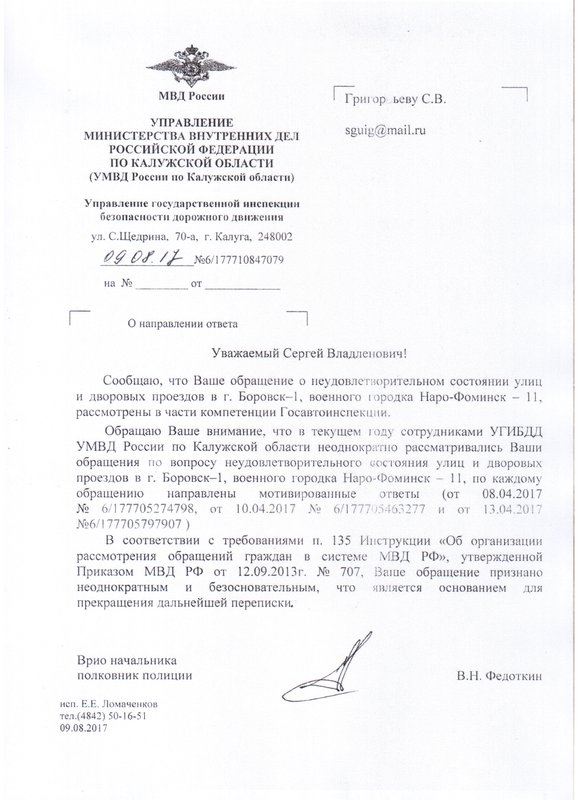 С 2013г. жители нашего городка неоднократно обращались в подразделения УГИБДД УМВД России по Калужской и Московской областей, Администрации Боровского и Наро-Фоминского районов, органы военной прокуратуры о неудовлетворительном состоянии улично-дорожной сети населённого пункта Наро-Фоминск-11 Московской области (г.Боровск-1 Калужской области), которая с 2009г. не учтена установленным порядком как имущество ФГКУ «Центральное территориальное управление имущественных отношений» Министерства обороны Российской Федерации и Государственное имущество, так как сведения о нём отсутствуют в Федеральном агентстве по управлению государственным имуществом, о чём свидетельствуют неоднократные ответы из данного ведомства. Вот уже 3 года, безрезультатные проводимые проверки, как специалистами прокуратур Западного военного округа, Калужского гарнизона, в/ч 30642, прокуратур Московской и Калужской областей, Боровского и Наро-Фоминского районов, органов безопасности дорожного движения Калужской и Московской областей, не приводят к ожидаемым результатам – постановке дорог на баланс и проведению ремонта, в соответствии с предъявляемыми требованиями ГОСТ и СНиП: https://vk.com/public92690509?z=album-92690509_225030735. По всей видимости, Ваши подчинённые прокуроры и иные государственные структуры, с 2009г. не в состоянии провести полную и всестороннюю проверку, в ходе которой установить конкретных виновных лиц от действия и бездействия которых инфраструктура городка пришла в упадок и не принимается на баланс военного ведомства, привлечь их к ответственности, а также принудить к исполнению своих непосредственных должностных обязанностей и наконец-то разрешить дорожный вопрос в нашем населённом пункте!!! Так, как ФГУП «ЦТУИО» МО РФ уже, как минимум 2 года обещает органам прокуратуры и жителям принять меры по организации приёма улично-дорожной сети городка на балансовый учёт, а также меры по включению объектов недвижимости в техническое задание к соответствующему государственному контракту с ФГУП «Ростехинвентаризация – Федеральное БТИ». Но ничего не меняется. Поговариваю, что государственный контракт, на который все ссылаются в своих ответах-отписках, уже давно не действует!?! Сколько это безобразие будет продолжаться!?! В настоящее время состояние дорог всей жилой части городка и придворовых территорий не изменилось, требуют проведения капитального ремонта!!! Выделить денежные средства, на который целевым назначением не представляется возможным по известной Вам причине - отсутствия собственника - балансодержателя (обслуживающей организации) у наших дорог. Привлекать внебюджетное финансирование, в нашей ситуации, чиновники не спешат. Состояние дорожного покрытия не соответствующее ГОСТ и СНиП затрудняет передвижение рейсового, школьного автобусов, военных и гражданских транспортных средств, пешеходов и других участников дорожного движения. Создают существенные неудобства в повседневной жизнедеятельности жителей, военнослужащих и военной техники, несущих боевое дежурство и выполняющих задачи по обеспечению безопасности Государства, что подтверждено 26 марта 2016г. специалистами УГИБДД УМВД по Калужской и Московской областей в ходе обследования улично-дорожной сети городка. Вместе с тем, в порядке информации, для принятия мер прокурорского реагир