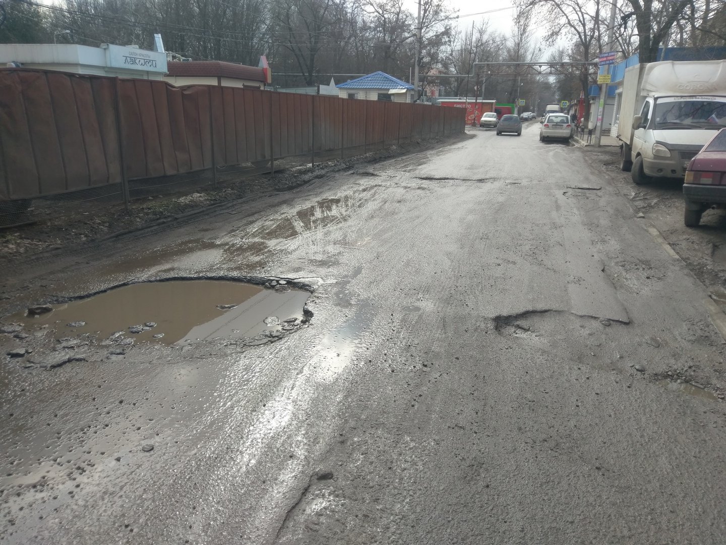 Огромные ямы поперёк всей ширины проезжей части. Между платной парковкой и домом Авиагородок 18.