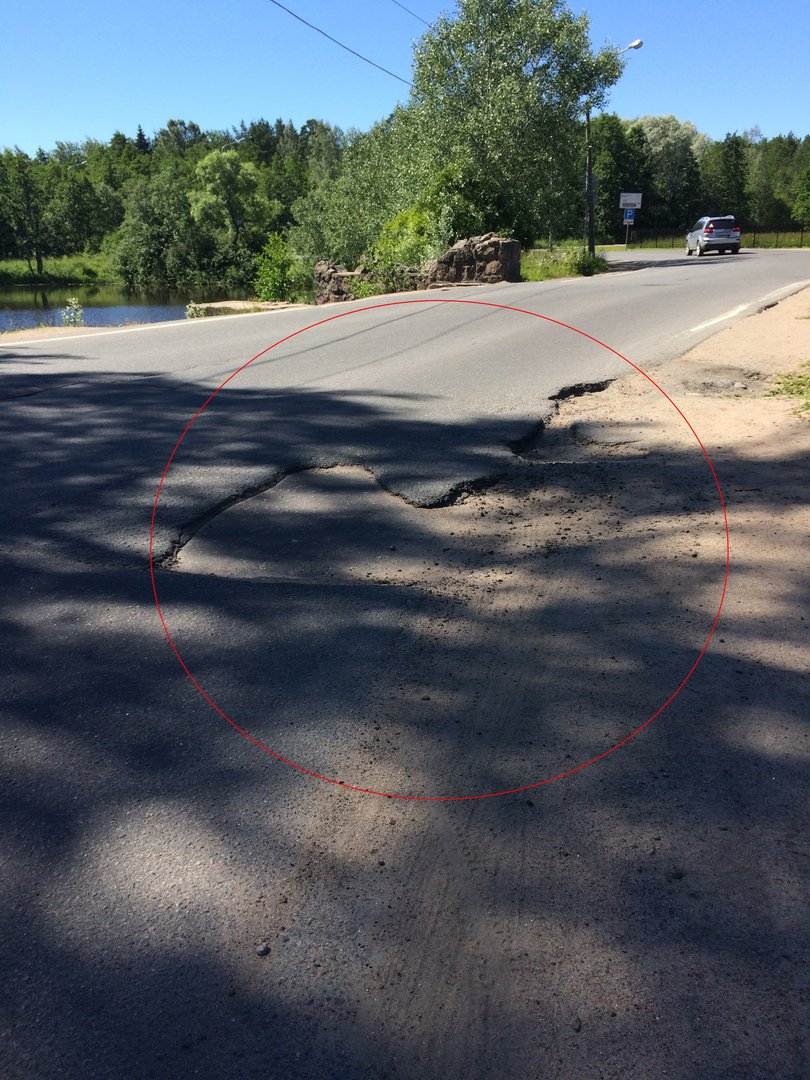 Износился асфальт на слишком узкой дороге. Создаётся весьма аварийная ситуация при лавировании среди выбоин.