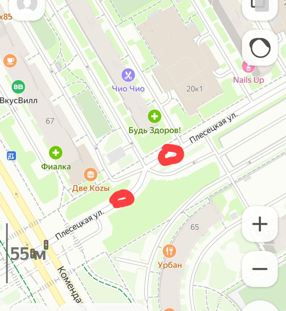 Две глубоких канавы на пересечении Комендантский пр.67 и 65 и Плесецкой улицы, одна яма перед светофором, вторая чуть далее, что заставляет выезжать навстречку. Периодически эти ямы ктото засыпает щебенкой, но колесами общественных автобусов и частными автомобилями это быстро выбивается,проблема возникла еще в начале мая, никто решать не торопится. Далее, очень много около пяти ям выбило в проезде около гипермаркета Лента на Парашютной 60.