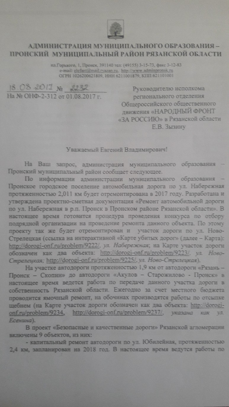 18.08.2017 поступил ответ из администрации Пронского района о том, что указанный участок дороги будет отремонтирован в 2017 году.